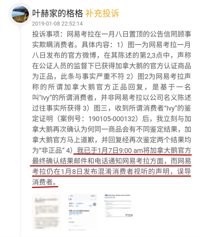 当天网易考拉客户服务部回应:“目前,加拿大鹅官方已告知我们可以进行线下实物鉴定,我们正在积极联系鉴定处,准备线下实物鉴定。请您理解和等待一段时间。等鉴定结果出来,我们会及时向用户和公众公布,同时我们也会向加拿大鹅官方了解邮件鉴定结果不一致的原因。 如果您对最终鉴定结论仍有疑问,您可以保留好商品,等待我们第一批实地监测结果出来后和您联系,并安排好线下送检。”