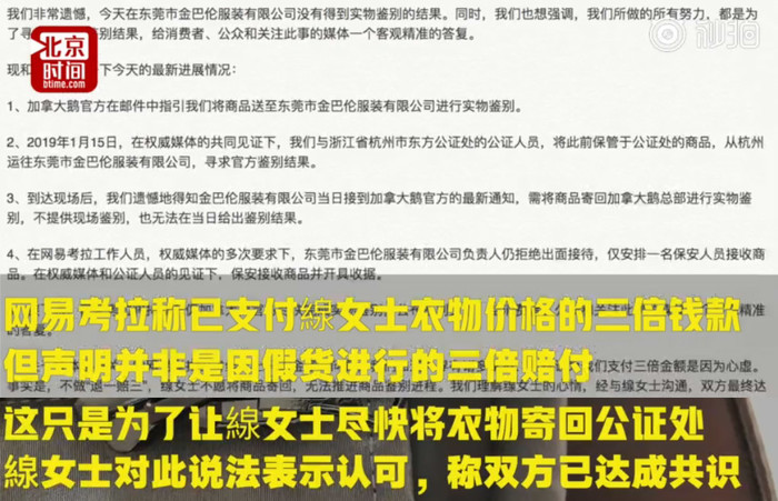 对于鉴定结果不一致,网易考拉声明称,将在公证人员监督下,将商品原件送至加拿大鹅总部进行实物鉴定,并称将投诉加拿大鹅品牌鉴定流程中的不透明。