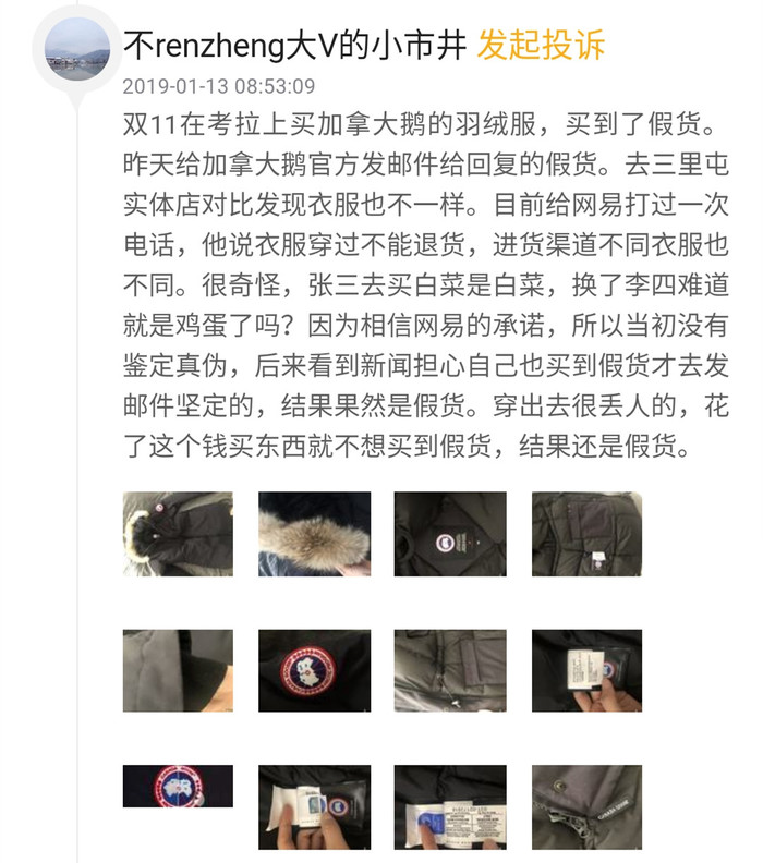 一波未平一波又起,消费者@不renzheng大V的小市井 在1月13日投诉称,双11在考拉上买加拿大鹅的羽绒服,买到了假货。给加拿大鹅官方发邮件给回复的假货。去三里屯实体店对比发现衣服也不一样。