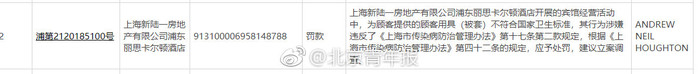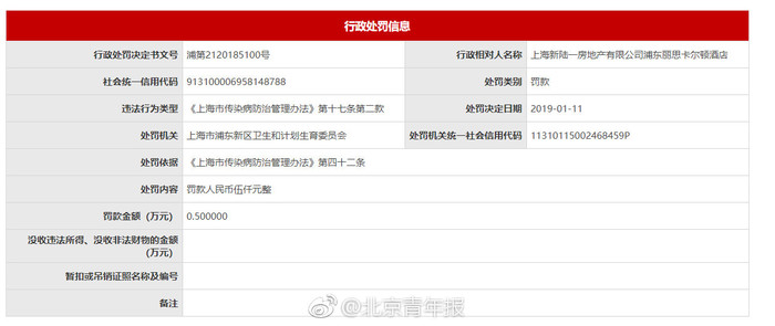 北青报记者在上海浦东新区行政处罚公示信息官方网站看到,1月11日,上海市浦东新区卫生和计划生育委员会依据《上海市传染病防治管理办法》第四十二条,对浦东丽思卡尔顿酒店做出了罚款5000元的处罚。其违法事实表明,该酒店“为顾客提供的顾客用具(被套)不符合国家卫生标准,其行为涉嫌违反了《上海市传染病防治管理办法》第十七条第二款规定。浦东新区卫生和计划生育委员会监督所负责人向北青报记者表示,两家酒店的处罚结果已经生效了,两家酒店的处罚依据是一致的,处罚金额也均为5000元。