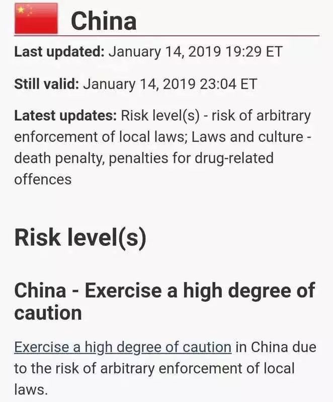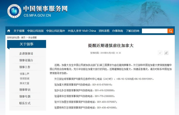 作为回应,1月15日,外交部和中国驻加拿大使领馆提醒中国公民结合自身情况,充分评估前往加拿大旅行的风险,近期谨慎前往加拿大。原因是“近期加拿大发生中国公民被加执法部门以第三国要求为由任意拘押事件”。