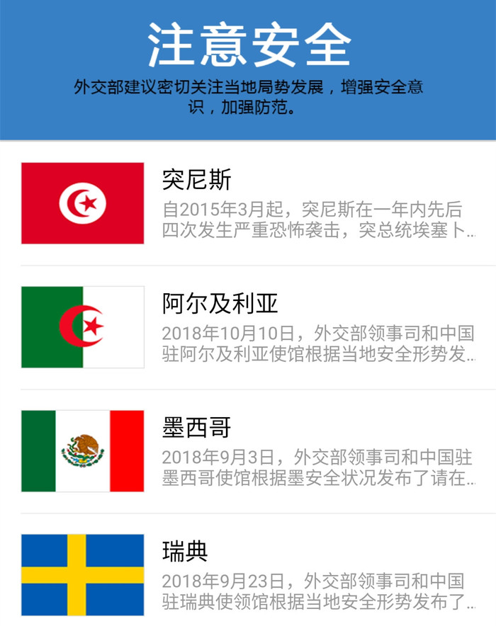 外交部的公众号“领事直通车”对安全提醒这一块分了三类:
