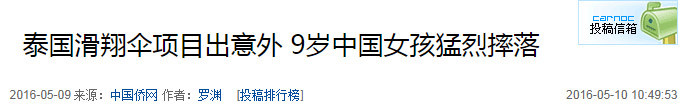 2016年,一名9岁中国女孩也因这个项目发生了意外。警方调查获悉,事发前,船只牵引的绳索搅到海边松树,导致滑翔伞失控飞速掉落海滩上,坐在滑翔伞上的Lirui Tong(9岁,中国籍)与滑翔伞安全负责人重重摔下,导致该女童胸部、尾骨周围受伤,滑翔伞负责人巴达兴(30岁)重伤。
