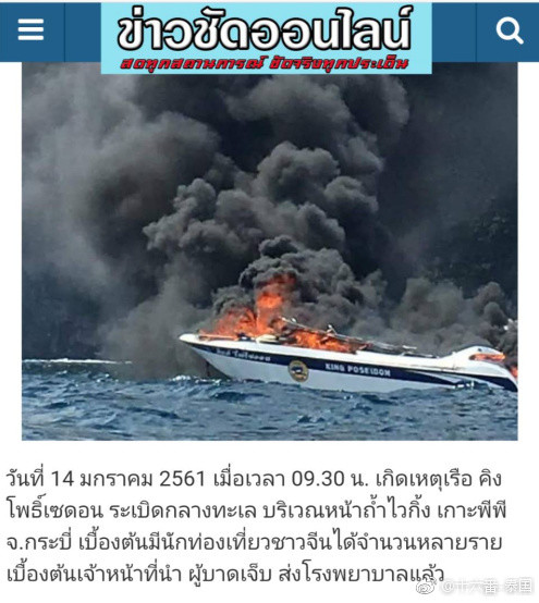去年1月14日,泰国JS100交通电台消息称,一艘载有多名中国游客和5名泰人的快艇于上午抵达皮皮岛VIKING洞时,突然发生漏油并起火爆炸,每日新闻称爆炸造成接近40名游客受伤,初步调查发现船长和中国游客共计五人重伤。