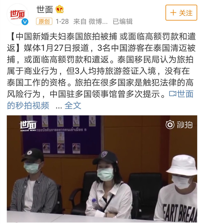1月29日,【中国新婚夫妇泰国旅拍被捕 或面临高额罚款和遣返】在微博刷屏,原文↓↓↓