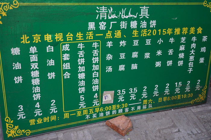 来到黑窑厂街糖油饼很多人在排队,很多是本地人,也有像我们这样拉着行李箱的游客。这间在大众点评可是排名第一的,看游记也很多人在夸,我那个坑妹的姐也叫我一定要去,所以我们就毫不犹豫地点了双面糖糖油饼、羊杂汤、豆腐脑、豆浆,牛舌饼我们这么早去也卖完。支持微信支付,半自助式,饼在付钱那里拿,汤在里面厨房拿,筷子汤勺和旁边的小菜和酱料都是自助的,小菜很多人拿,但我最不明白为什么每个桌子中间都有个下陷的圆盆。