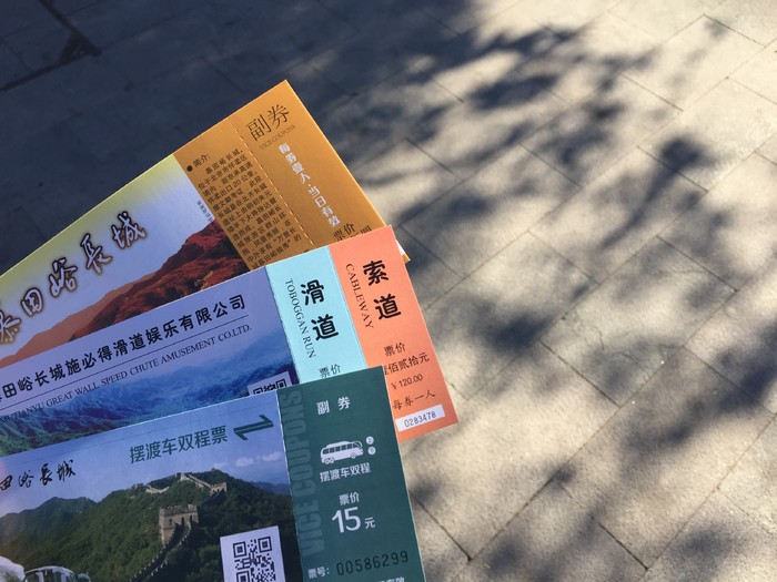 去到游客中心司机阿姨也很热情带我们去买票,送我们去摆渡车的地方(一条食街直走就是,门口有卫生间),长城就看你们要不要爬,我们行程这么紧打算上去打个卡就走,所以我们买了套票包括来回的摆渡车+滑道索道+长城门票(门票后面是明信片连邮票也有写好地址直接寄就可以),也可以选择缆车,不过天气好、年轻的人们建议选择滑道和索道,很好玩,有恐高症的我虽然在索道上抖个不停都还是建议大家坐,而且这里滑道索道和缆车是不同公司的,所以票是不互通的,如果选择缆车就来回都是缆车,索道滑道是上的时候是索道下来是滑道。还有一种富豪选择就是直升机,俯瞰长城,不过不知道直升机能不能停在上面。