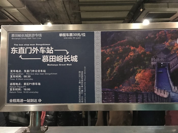 第二天早早起床吃了昨天打包姥姥家的春饼就出发去东直门,之前看游记说去慕田峪长城的巴士是停在路边,其实不是 ,是停在东直门地铁站出来一个很大的建筑物里,里面就是东直门枢纽汽车总站,看到有公交车出来的地方走进去就是,找到916快线,排队等车就可以了,要听清楚站台人员说能不能去慕田峪长城才上车,有些是短线不停怀柔,上下车刷卡就可以了。挺远的建议等到有位置坐才上车,大概坐一小时到怀柔北大街站下车,如果早的话可以去对面等h24公交车,不过一天只有两班,上午9点一趟(8.40),下午三四点一趟(15.45),一般人估计是赶不上,所以建议拼车,拼车一般10块钱一个人,可以讲价20块钱3个人之类,坐我们隔离那个阿姨就是黑车司机,问要不要载我们去,另外有两个乘客也想跟我们拼到半路下车,看着他们挺安全的样子跟他们走,正如上面所说北京人真的很爱唠嗑,一直唠嗑一整段路,回程也是阿姨自己找其他人跟我们一起拼回去。