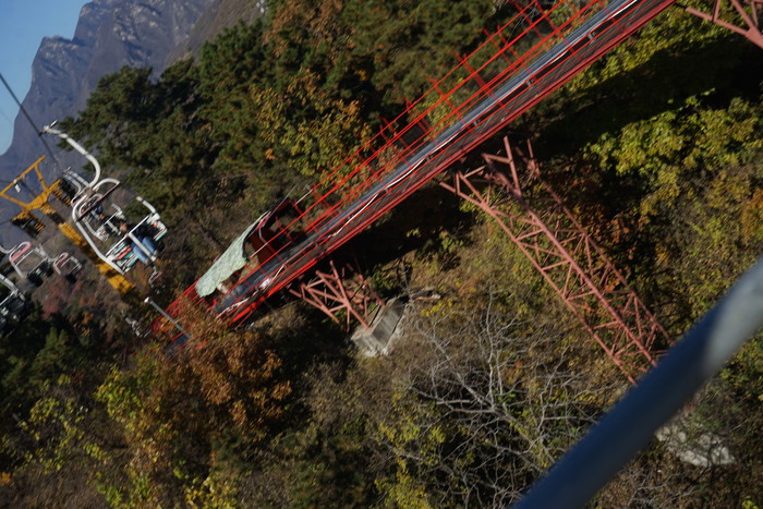 索道是那种只有铁架座位,脚也是只有一根铁棍踩着,大家要小心东西不要掉下去,不然是捡不到的,虽然相对没那个安全但能更好拍到照片(害怕到手抖的我只有几张可用,大家张就着看吧,扶额),滑道可以自己操控速度的,每个拐弯位都有工作人员相对安全很多。建议最好在你前面的人是敢玩的,不然前面会限制你的速度,滑道真的很好玩,推荐推荐。(红色那条就是滑道,当时上去手太抖没拍好,下去的时候要双手操控的所有没拍到,索道两个人一组,模糊的龙龙一个人承包整个座位,一位唔好扮两位)