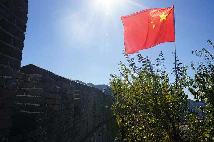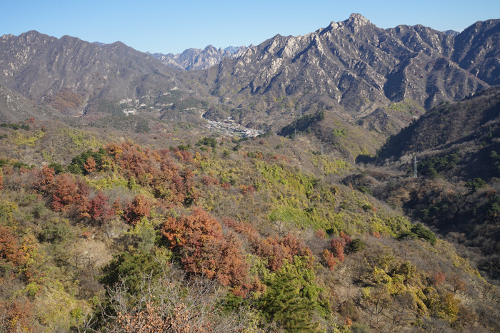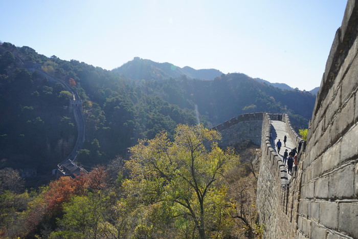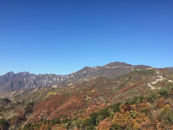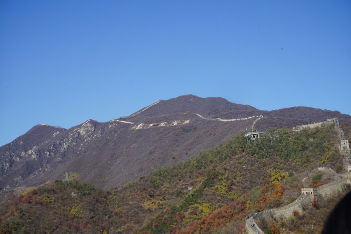 上到长城不知道是不是工作日的关系人真的不多,零零星星几个人而已,还是外国人占大部数,而且天气阳光都超好,植被也是我想要那种五颜六色秋天的感觉,连照片拍出来都有点假的感觉,远处的山上还有写着“忠于毛主席”的几个大字。