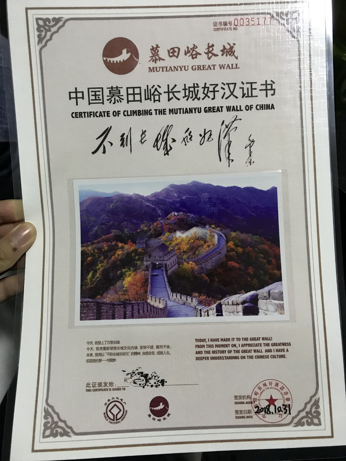 往回走坐滑道和摆渡车下来,用套票去免费换“不到长城非好汉证书”,虽然他们会收你一点加工费,不过你也可以不拍照不加明信片不过塑直接拿空白证书,索道和滑道都有人拍照弄成纪念册的收费项目,看看你们需不需要。