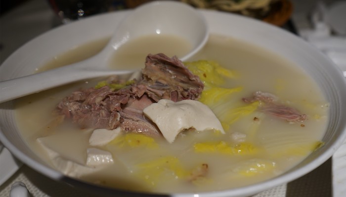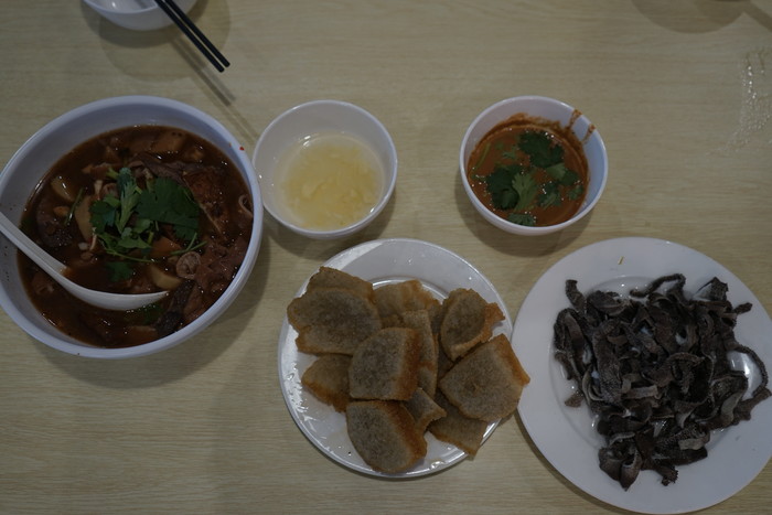 当我们满怀期待地尝了一下后,我们真的是满脸问号,别看这些菜颜色这么浓郁,除了糖饼其他根本就没有味道啊!连羊杂汤也是很淡很淡的,而且传说中最好吃的糖饼就是普通的糖炸饼而已。