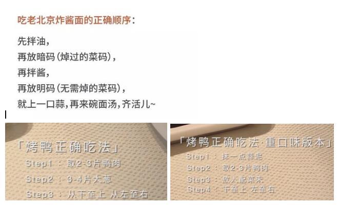 北京烤鸭三吃,如果点一整只北京烤鸭不仅在你面前切片还可以加点钱拿鸭骨去熬白菜鸭架汤,或者酥炸鸭骨,建议还是弄汤比较好。一整只鸭除了鸭骨分三碟上,第一碟建议点白糖或者蜜瓜空口吃鸭皮,第二碟就可用鸭饼包鸭皮鸭肉加北京烤鸭酱之类的包着吃,第三碟就是鸭腿之类,普通吃就可以了。北京烤鸭的吃法可以参考下图,不过大家喜欢怎么吃九怎么吃吧,我比较喜欢加点黄瓜这样口感比较清爽。味道吧确实是很好吃,特别是空口点白糖吃鸭皮,带着烤鸭香味的油脂混杂着甜味慢慢地化在嘴里。至于包着吃其实我在广州也有吃过味道差不多的,不过这里的鸭饼更薄,这里的鸭皮油香更浓,烤得更好,所以综合来说有点没有到达我预想的期待。