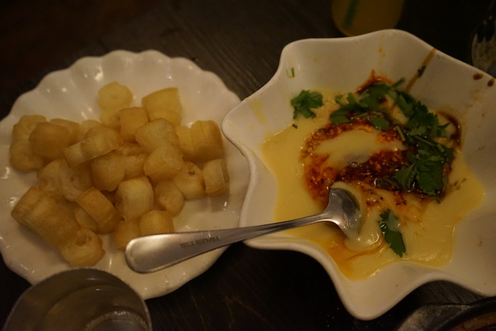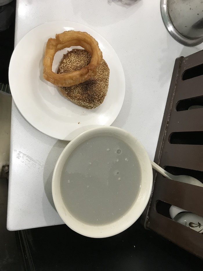 豆汁儿,就是传说种馊的豆浆,感觉真的是发酵过的豆浆,有点酸,但因为是热的关系所以也不是不能入口的。