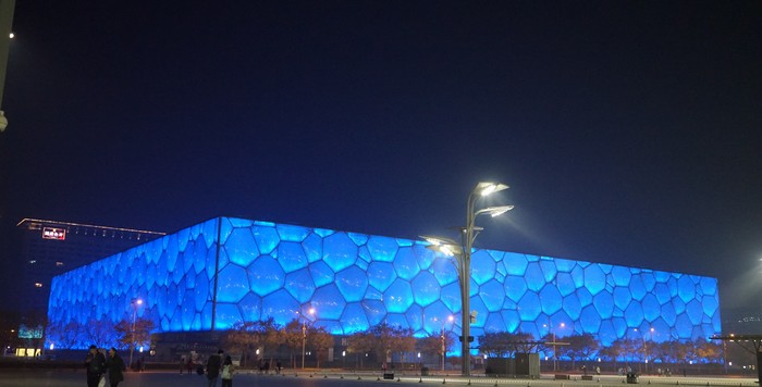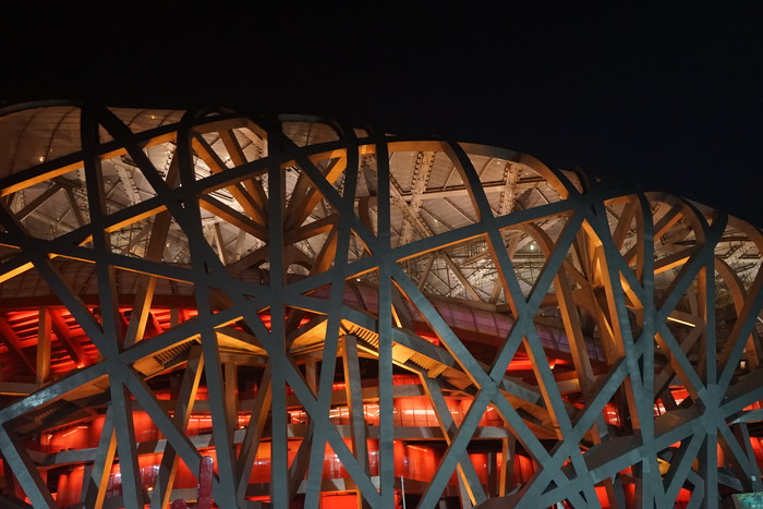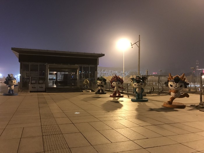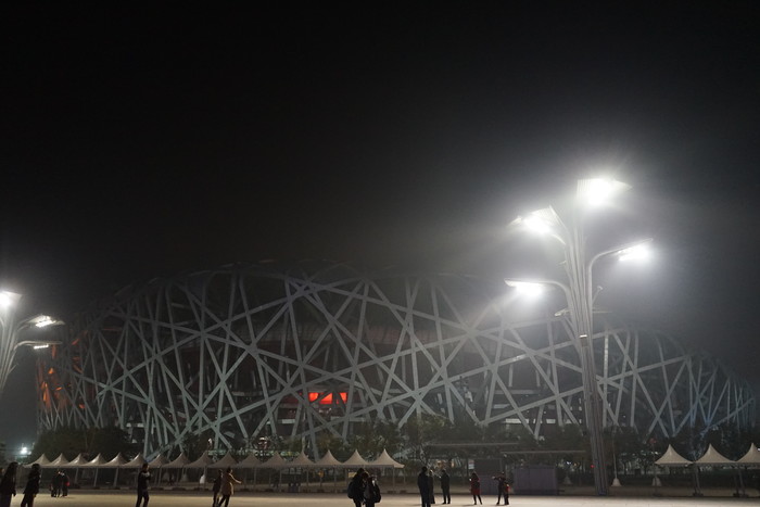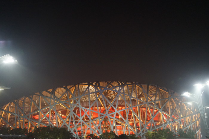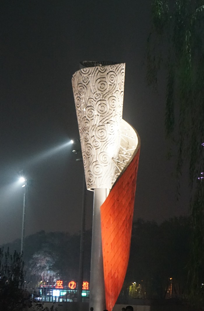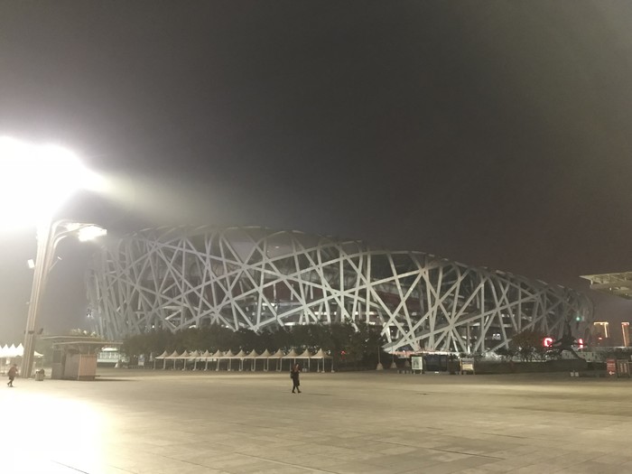 然后马不停蹄地打的去奥林匹克中心,要用身份证安检,进里面看到有个楼梯上鸟巢就往上走,上去能看到鸟巢、水立方、奥运圣火火炬。那天鸟巢还刚好有一些歌手为明天彩排,没认出是谁。正当我终于找到能拍到整个鸟巢的位置,刚举起相机的时候它居然给我!关!灯!了!