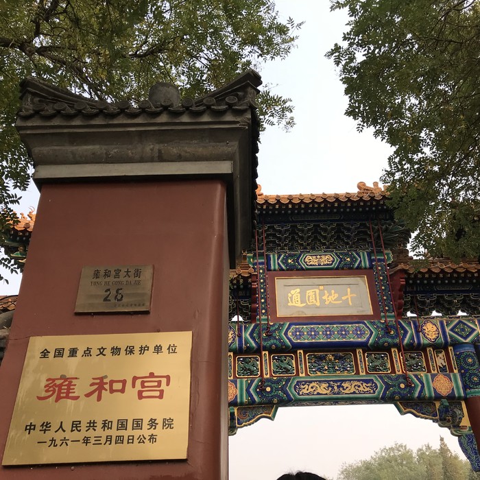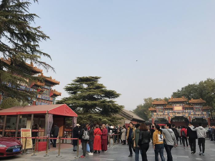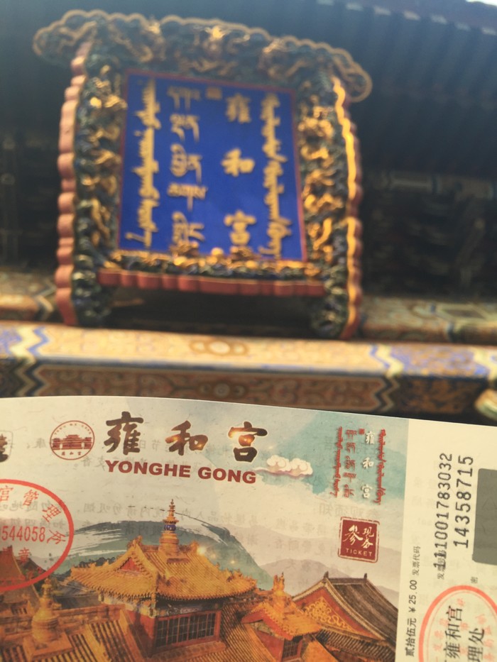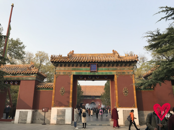 买好手信后打的去雍和宫和龙欢汇合,要在门口排队买票,只收现金,现在雍和宫已经改建成寺庙了,特别是万福阁说特别灵,雍和宫内不能拍照,安检检票穿过银杏道到门口两边可以免费拿香进去拜。