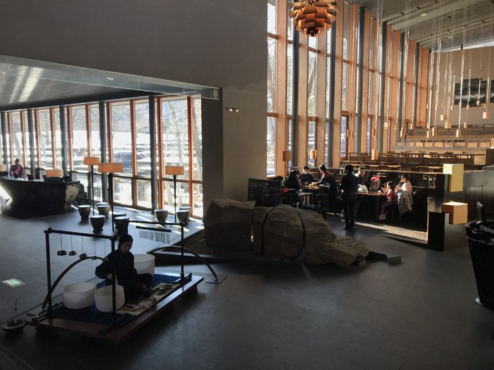 大约十多分钟的车程,经过村民食堂和蜻蜓之汤,便到了虹夕诺雅的大堂。有个妹子用奇特的器具在演奏欢迎曲。