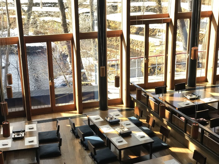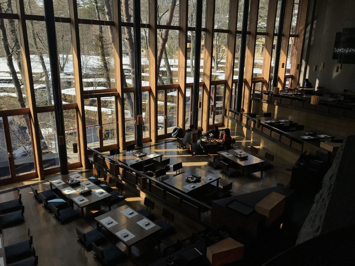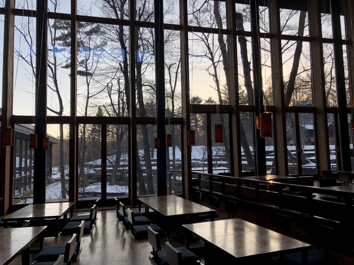 参观完石之教堂,我们走到离教堂很近的一家酒店,也是星野集团的,请前台帮忙叫车送我们去村民食堂。虹夕诺雅没有像传统日式旅馆那样规定必须一泊二食,所以我们不打算享用酒店的早餐和怀石料理(主要还是因为穷)。上一次来吃过他们的村民食堂,美味又平价。