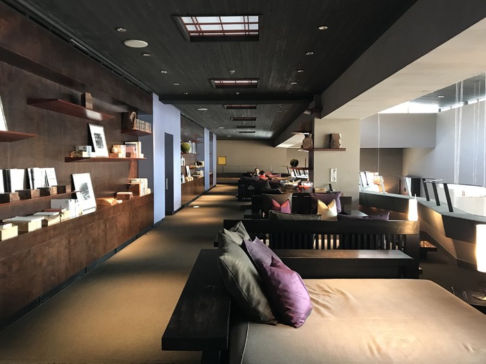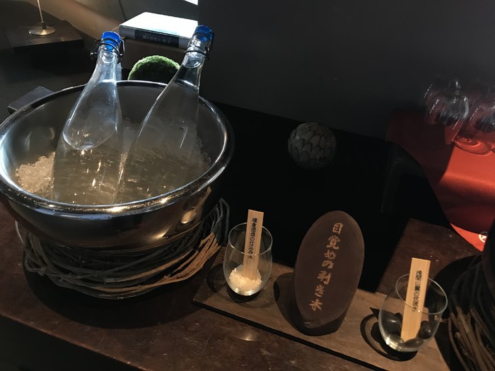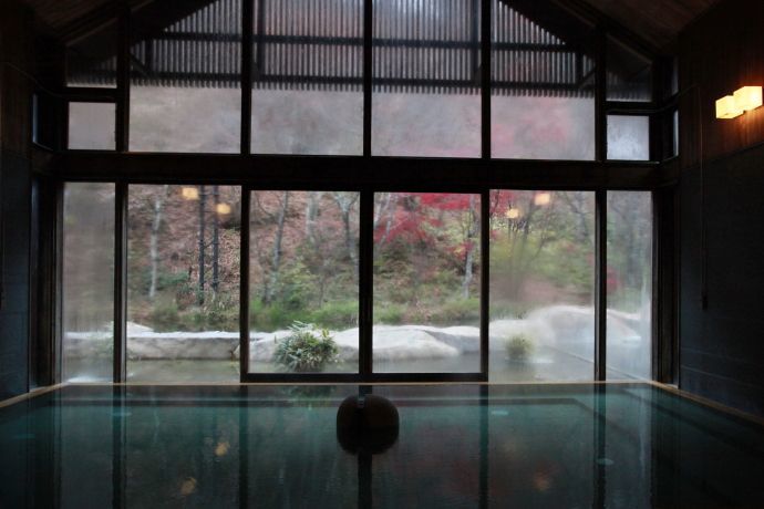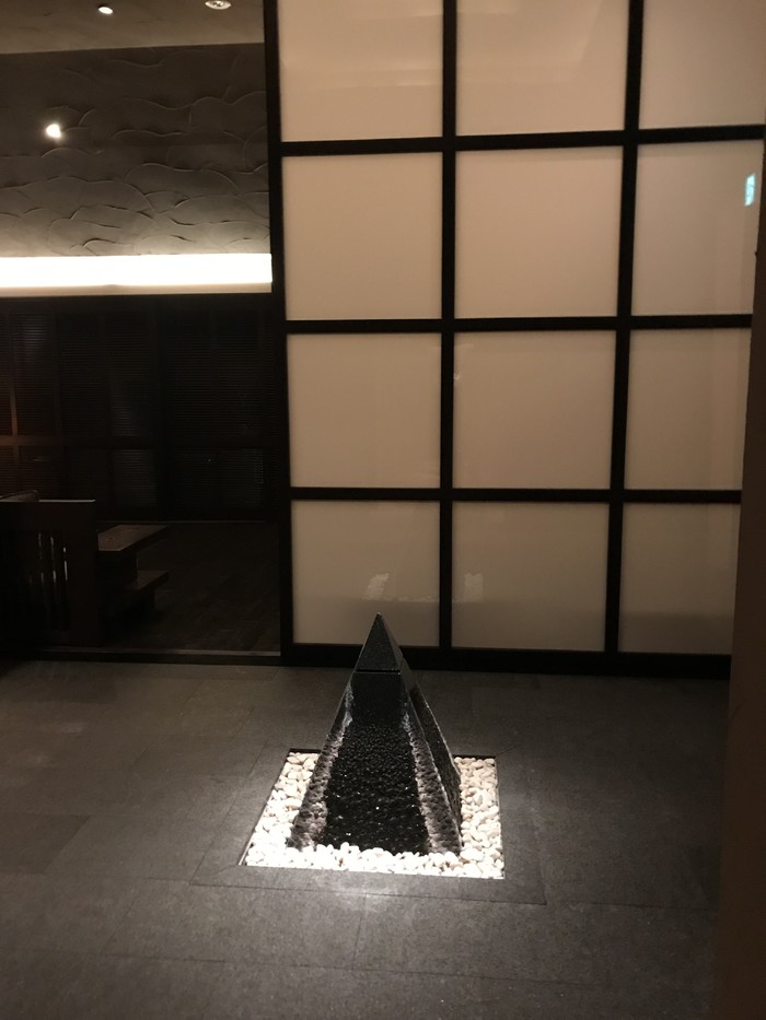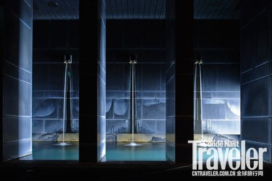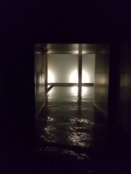 冥想温泉不大,但是设计感很强。进了温泉室左手边是淋浴,右手边是一个很窄的池子,用石墙分隔成三段,适应水温之后穿过这个窄窄的过道就进入光池,光池的尽头是一个仅容一人进入的小黑间,里面是纯黑的环境,美其名曰供客人放松冥想。于是我想着日本几大名鬼,在里面呆了几秒就冲出来了。