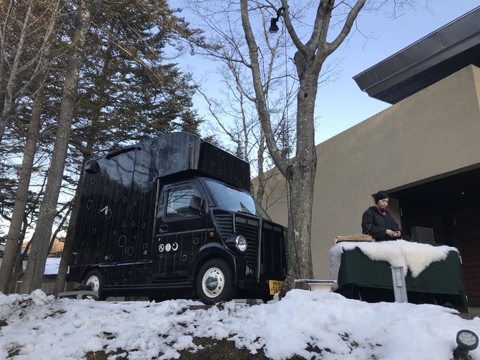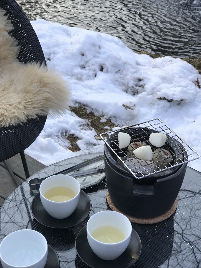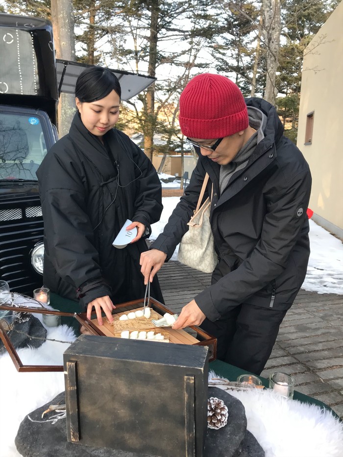冬季每天下午3点到5点,观景平台边会停着星野的小车为客人提供免费烤年糕和红豆汤。