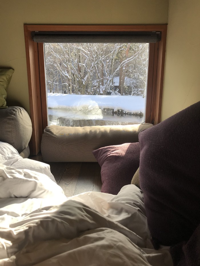 面朝湖水的那边还开了一扇窗,每天起床都有小鸭子来看我们。出太阳的时候干脆把被子抱到沙发上,做一条晒太阳的咸鱼。