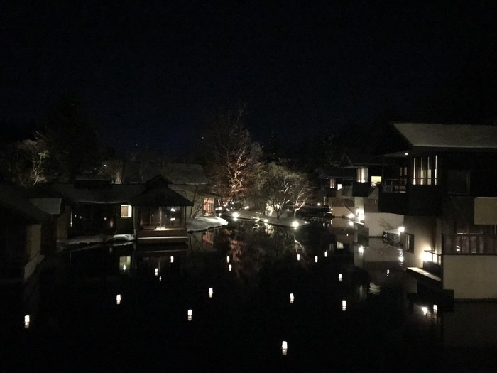 走到了冥想温泉的露台处,原来让我爱上虹夕诺雅的那个经典照片就是从这个角度拍摄的。每到傍晚,便有工作人员划着小船将湖面上的灯一一点亮。