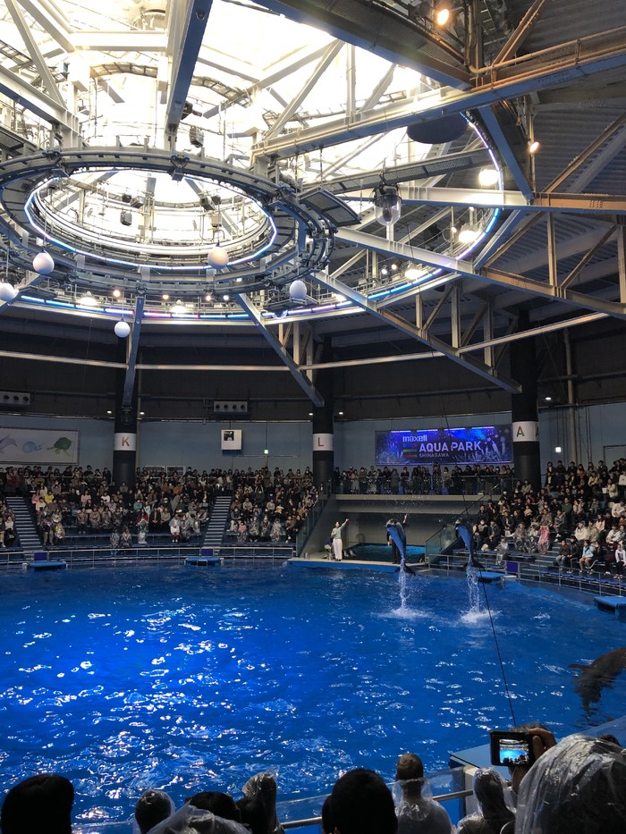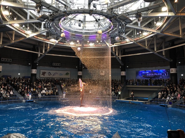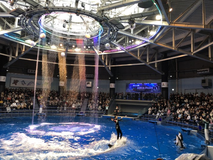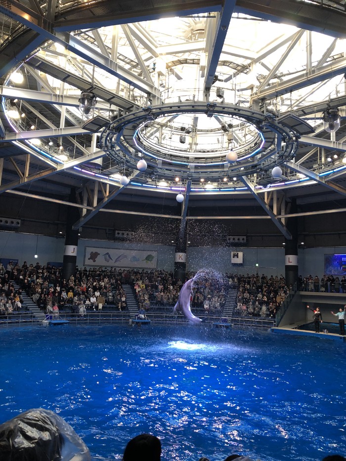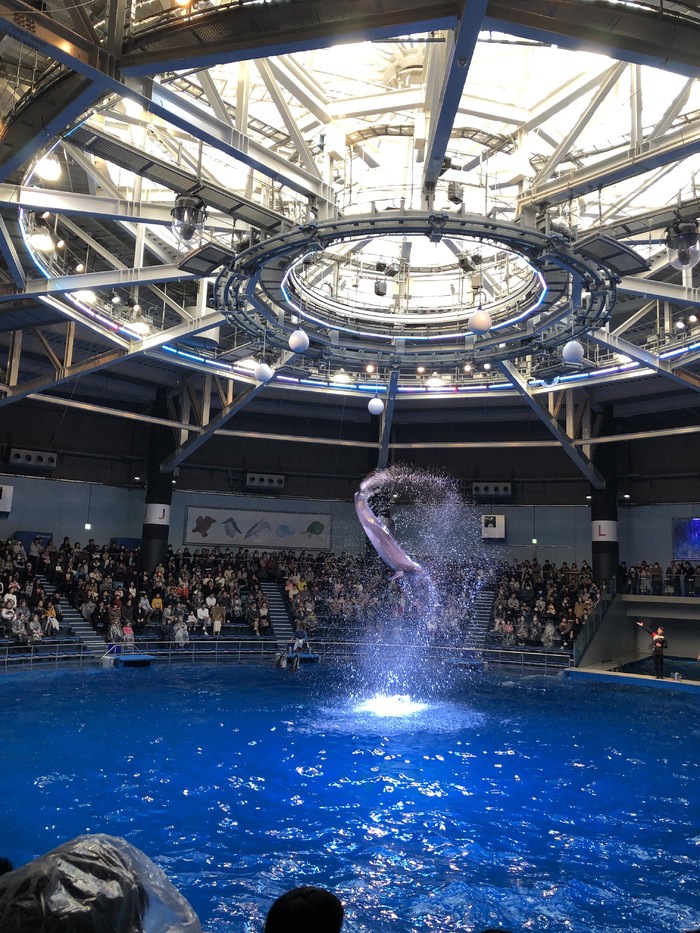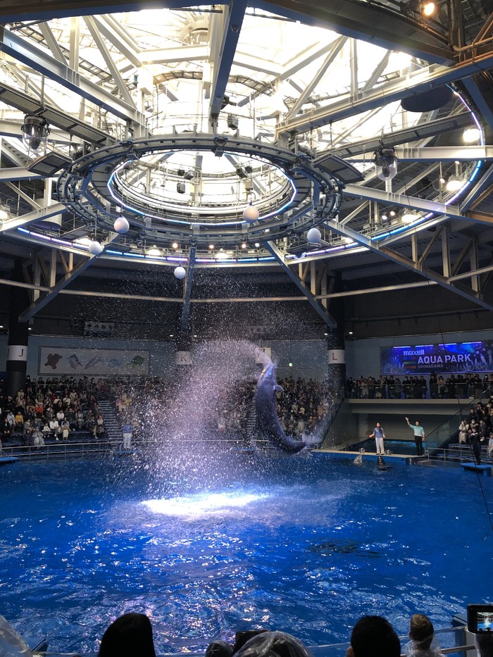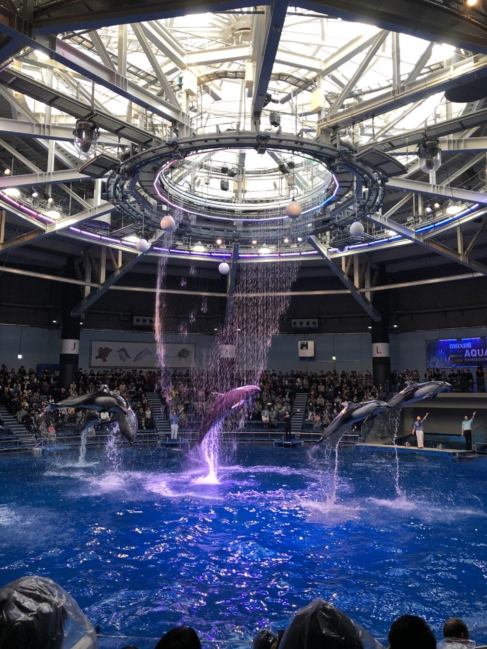 从涩谷搭JR到品川,这个水族馆在品川王子酒店边上,最有名的就是结合了水幕以及声光电的海豚表演。