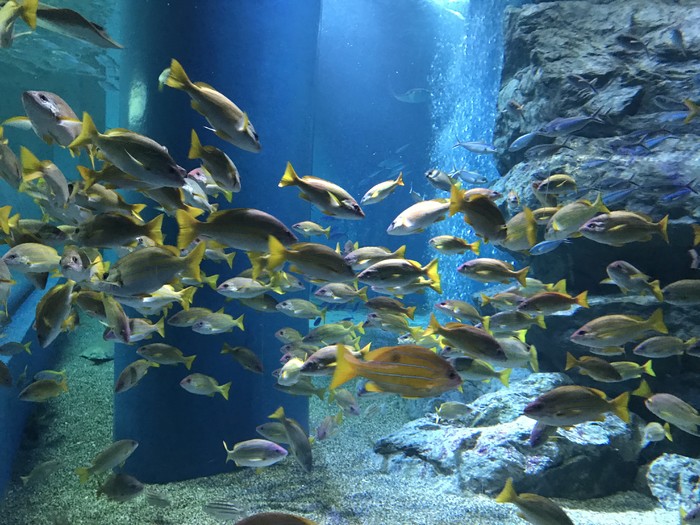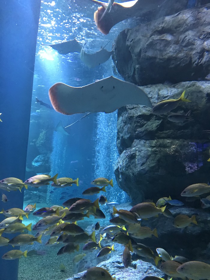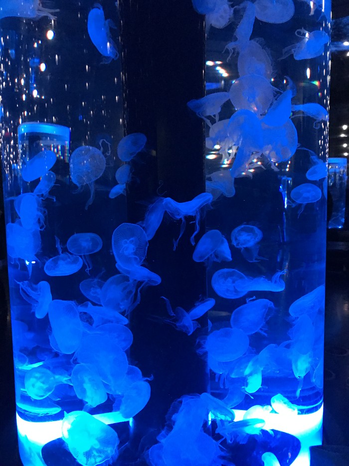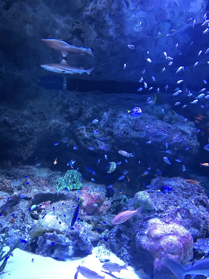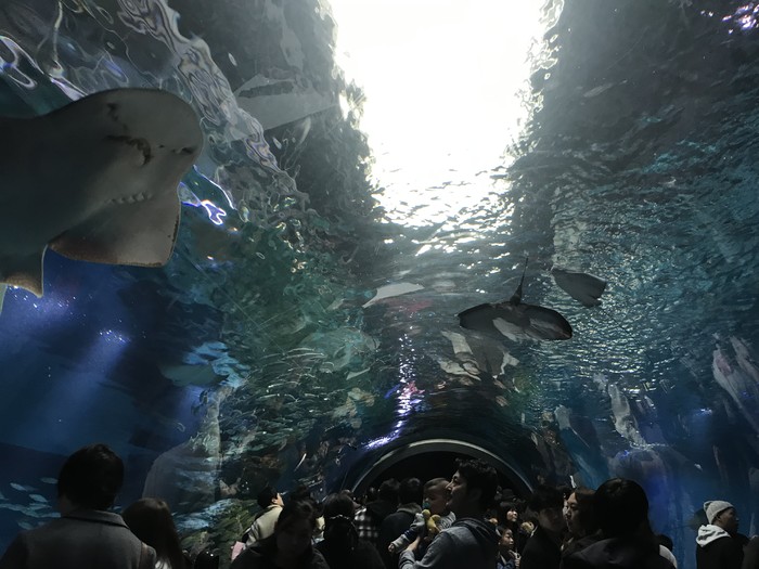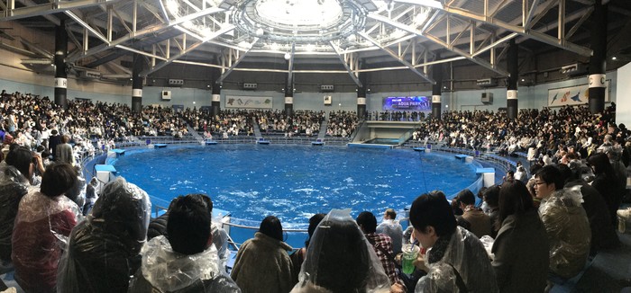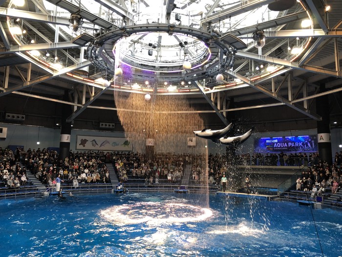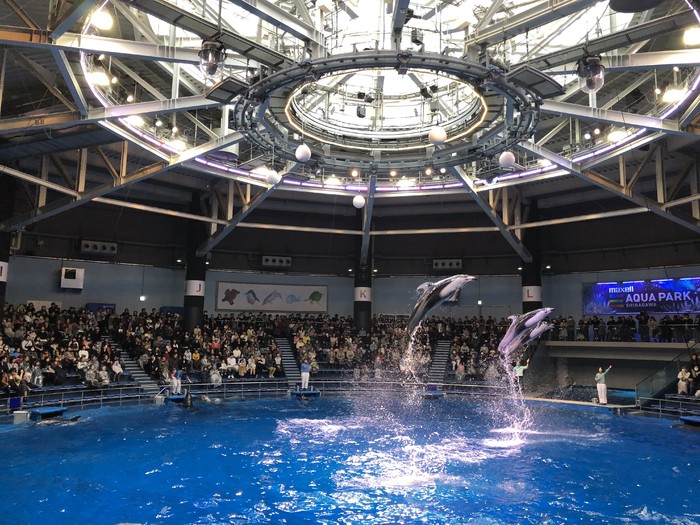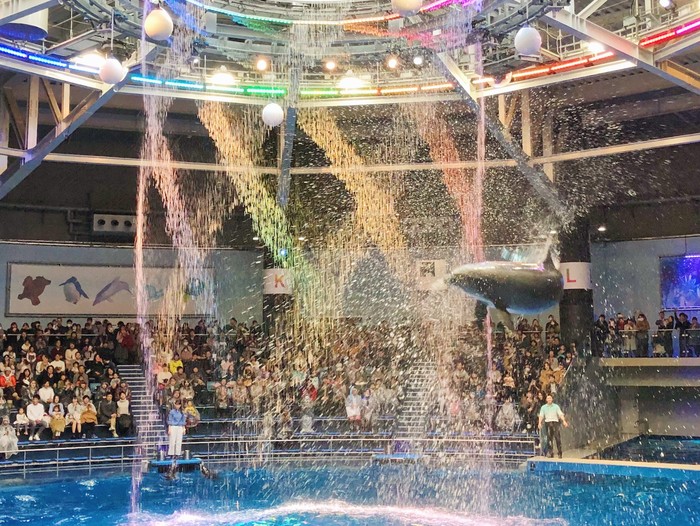 从涩谷搭JR到品川,这个水族馆在品川王子酒店边上,最有名的就是结合了水幕以及声光电的海豚表演。