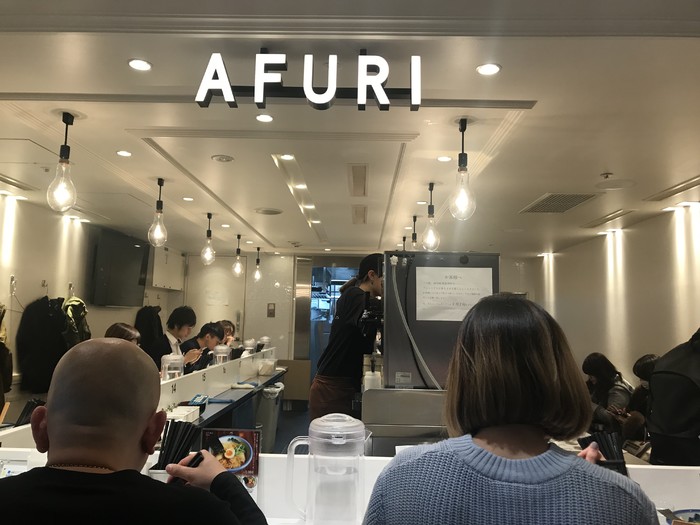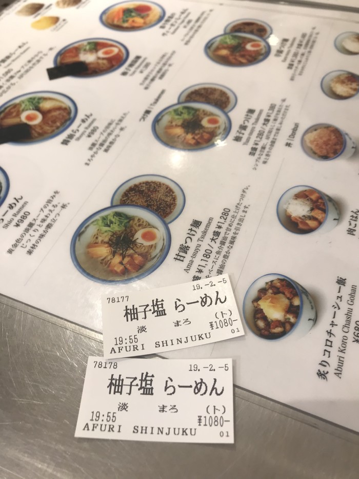 吃第一口Afuri我就惊艳了(当然一风堂也很好吃,超大一块肉)。很巧的是实体拉面店就在新宿站,生病的吃货如我还是很有行动力的,吃过了杯面之后意犹未尽,拉着老公去实体店再吃一碗。居然要排队,大众点评看了一下,网红店。