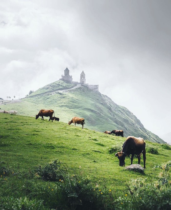 Gergeti Trinity Church 是格鲁吉亚的名片,教堂孤零零的矗立在远处的山头上,那么的孤独,又是那么的虔诚。驻足于山顶教堂前,可俯瞰整个斯特潘茨明达镇(Stepantsminda)。