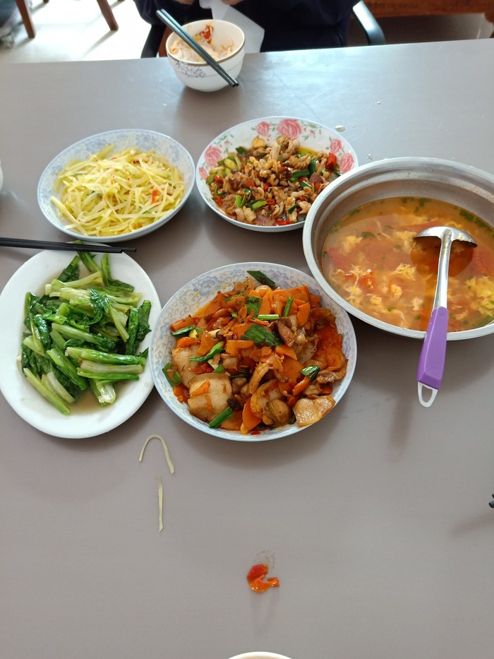 12号--后面几天跟老板重谈了住宿价格,也让老板包早餐,然后中午晚上有时候跟着那些爷爷奶奶一起吃盒饭,4个人是4菜一汤,我们谈的是按15块一个人一餐,还要说一下,老板做饭好吃!!!