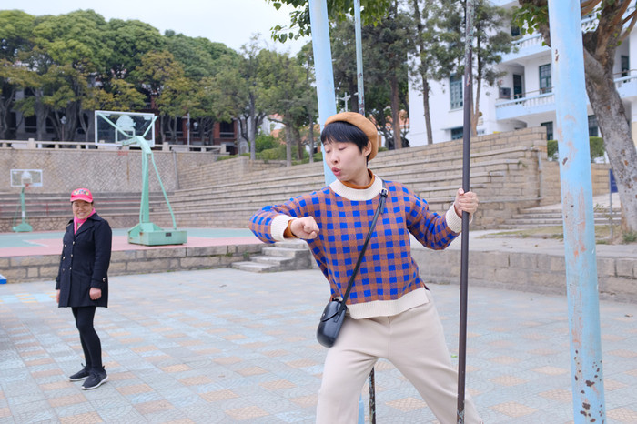 旁边阿姨看我们玩得欢,也想加入,看我的智障表演笑了。