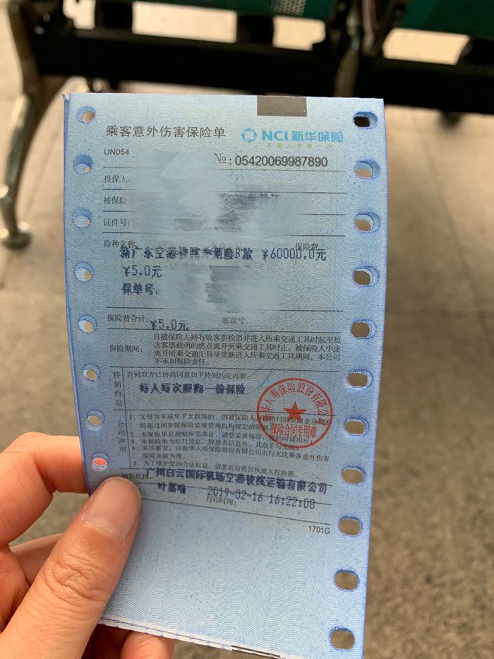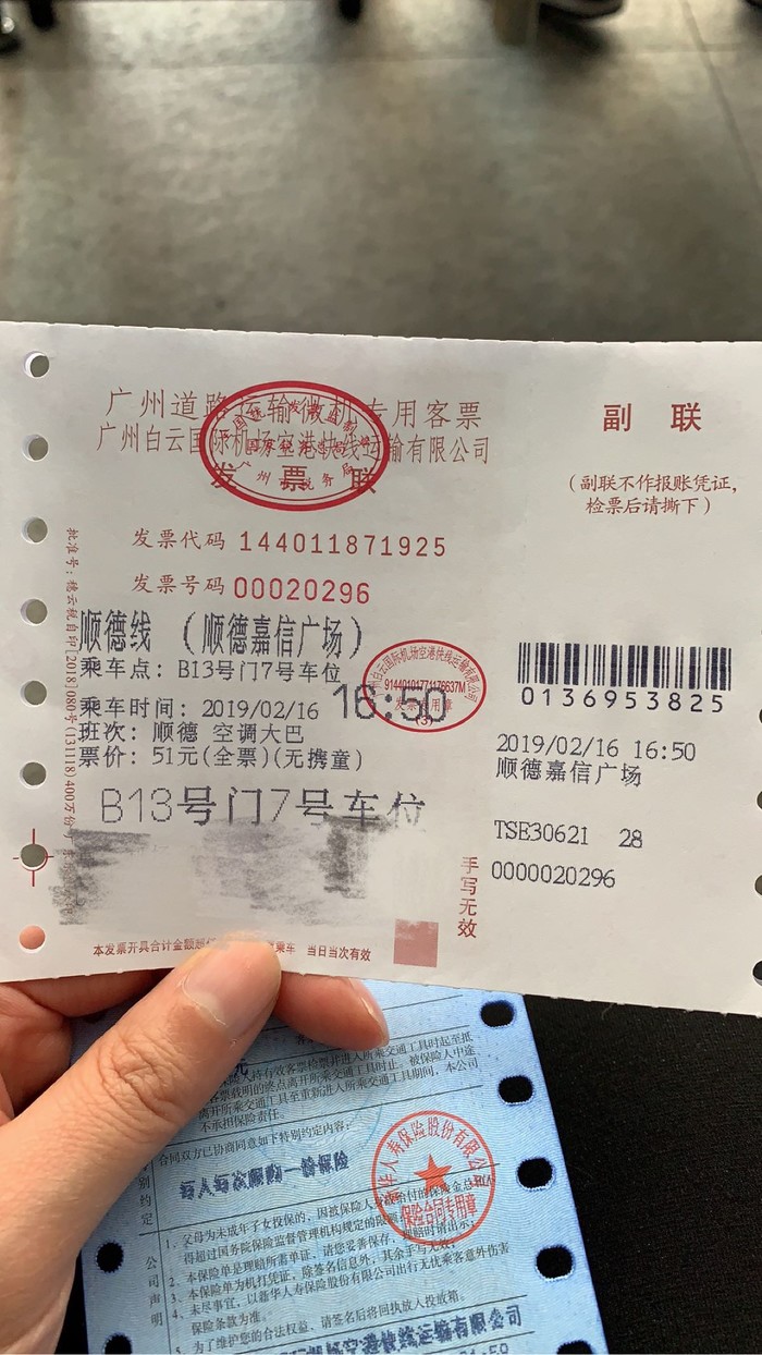 因为要去顺德玩,所以楼主不打算在广州逗留,直接坐大巴去顺德,机场到达大厅有出售机场专线的大巴车票,各个地方的都有,可以向咨询台询问,楼主买了3张去顺德的车票,终点为顺德嘉信广场,车票51元,另加5元保险费,所以就是56元每人,不堵车耗时大概是1个半小时