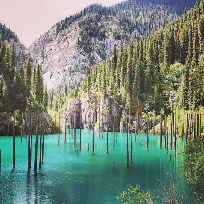 位于哈萨克斯坦境内的天山山脉,该湖因其美丽的景色而闻名,尤以其奇特的“水下森林”为甚。挺拔的云杉直直的长出湖面,在湖面之上的树干仿佛幽灵船的桅杆,又好像是神秘军队的长矛,等待着合适的时机跃出水面。