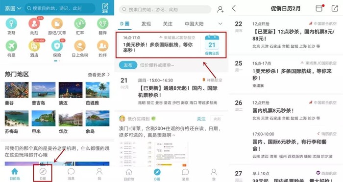 如何找到航司的促销信息:打开十六番APP,点击【D圈】,进入页面后,顶部有个【促销日历】,点进去即可,一大堆的特价机票~