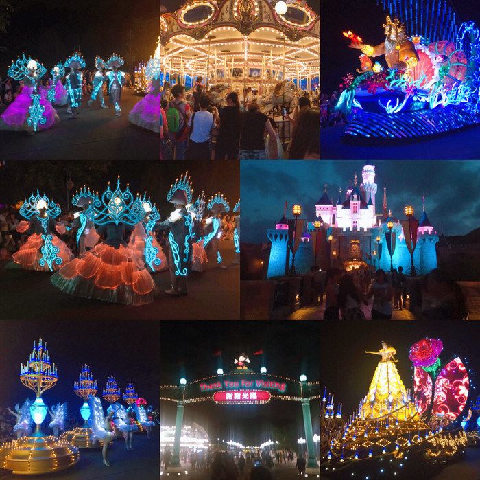 光影汇夜间巡游跟下午大同小异,但是都是带着灯光的花车,每个花车都是不同主题的迪士尼动画人物,配着欢快的音乐,现场气氛还是挺不错的