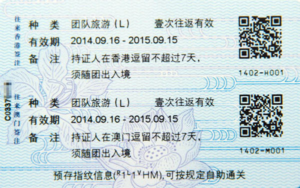 签证在你的港澳通行证上有,会标明你的G签,还是L签,假如有位旅客港澳通行证上注明是L签注,也就是跟团签注。