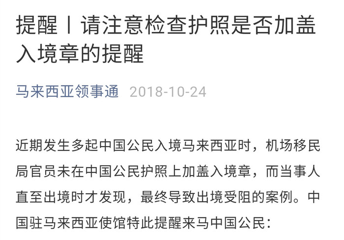马来西亚领事通之前就提醒游客在办理入境手续从移民官员取回护照时,要查验核实护照上是否加盖了入境章↓↓↓