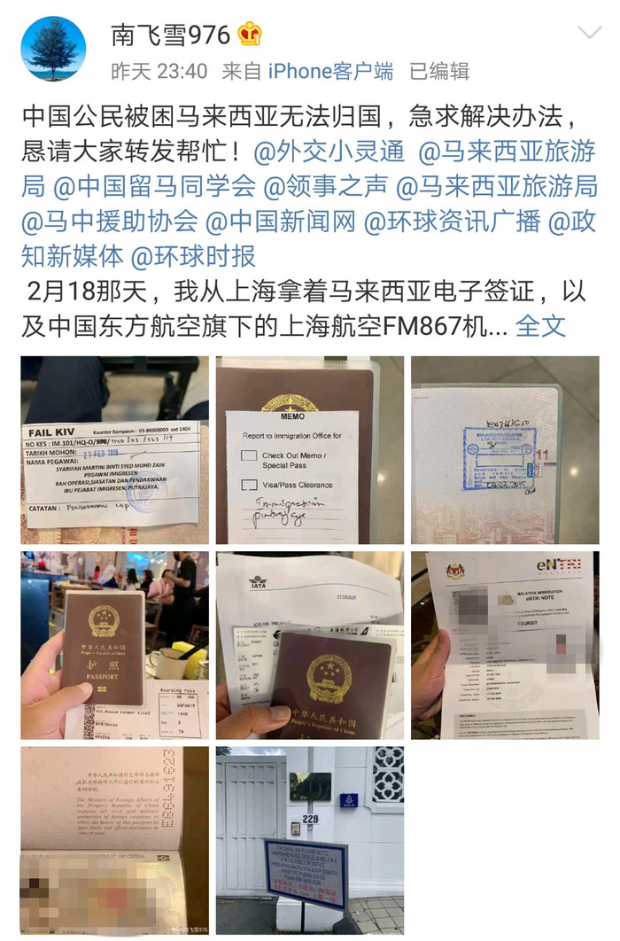 网友@南飞雪976 在微博上称:2月18日,拿着马来西亚电子签证,乘坐上海航空FM867前往马来西亚亚庇哥打京那巴鲁机场。到了2月26日那天,准备从吉隆坡回国,拿着登机牌和护照去安检扫描护照,被告知暂时无法出境。