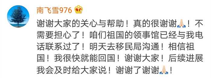3月6日晚,@南飞雪976 称,领事馆已经与他电话联系,第二天去移民局沟通。