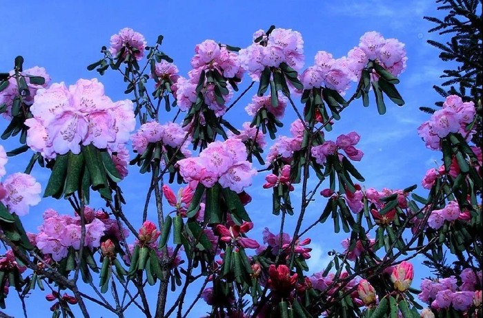 经过了严冬的凛冽,在春天晴朗的蓝天下,高山草甸之上;野杜鹃一齐开放,漫山遍野的杜鹃树红得轰轰烈烈;捧一团赤色的花瓣在掌心,就像捧着一簇簇灯笼和炽热的心。