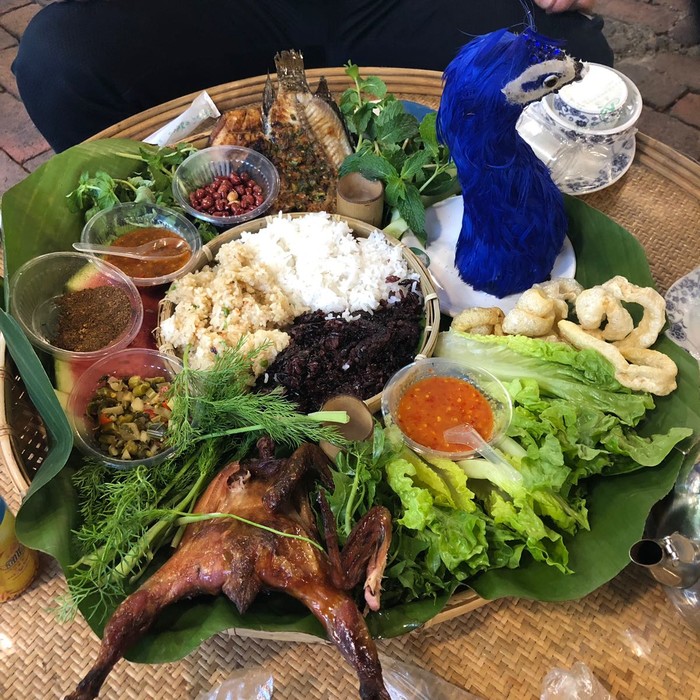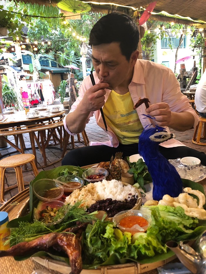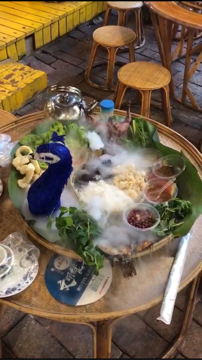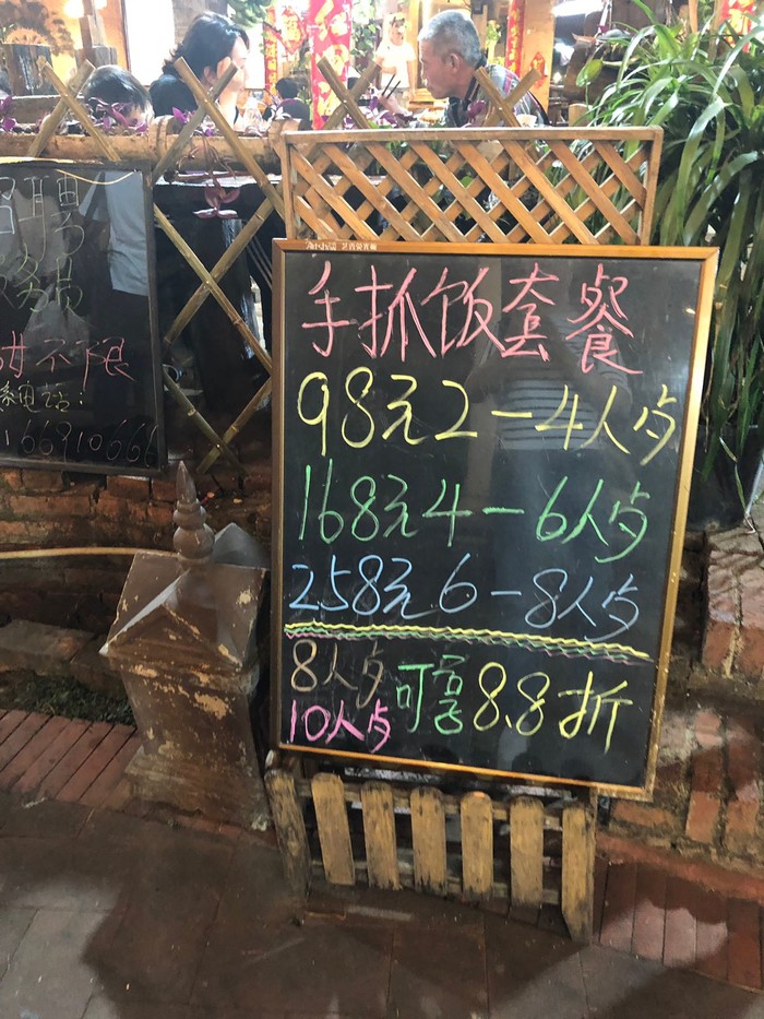 套餐:有一条烤鱼、一只烤鸡,炸猪皮、几种不知名的野菜,黄瓜、西瓜和几碟调料,中间配有菠萝饭+白米饭+黑米饭,味道虽然不能与川菜比美,但也还不错,品的是民族文化,尝的是地方美味。