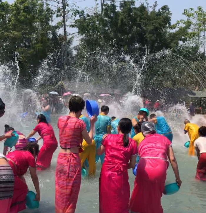 音乐喷泉,建在龙舟广场下侧澜沧江边,喷泉呈长方形,以S型数码喷泉和气爆泉为主体,