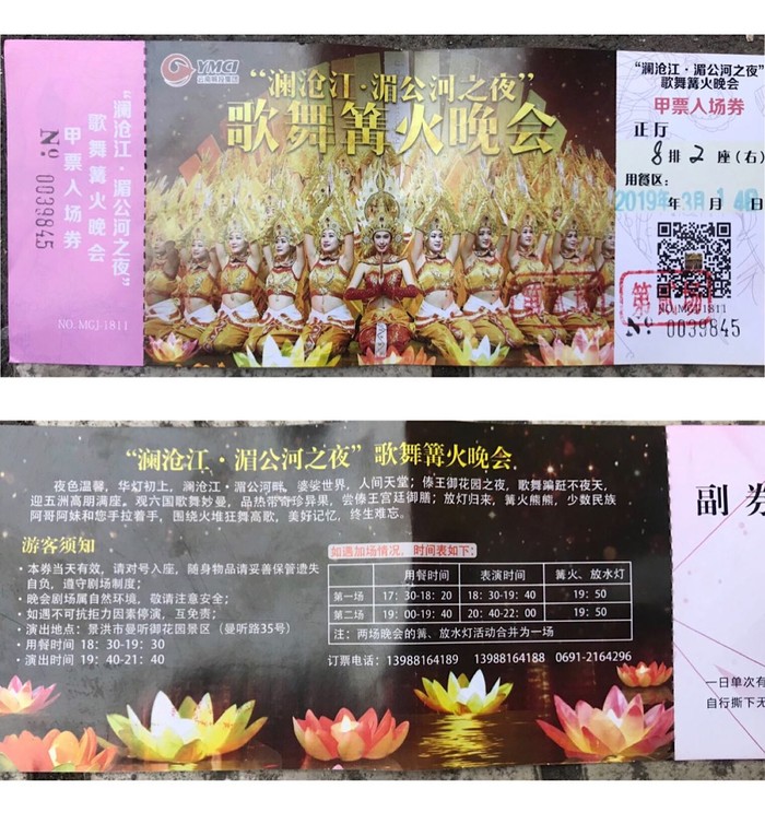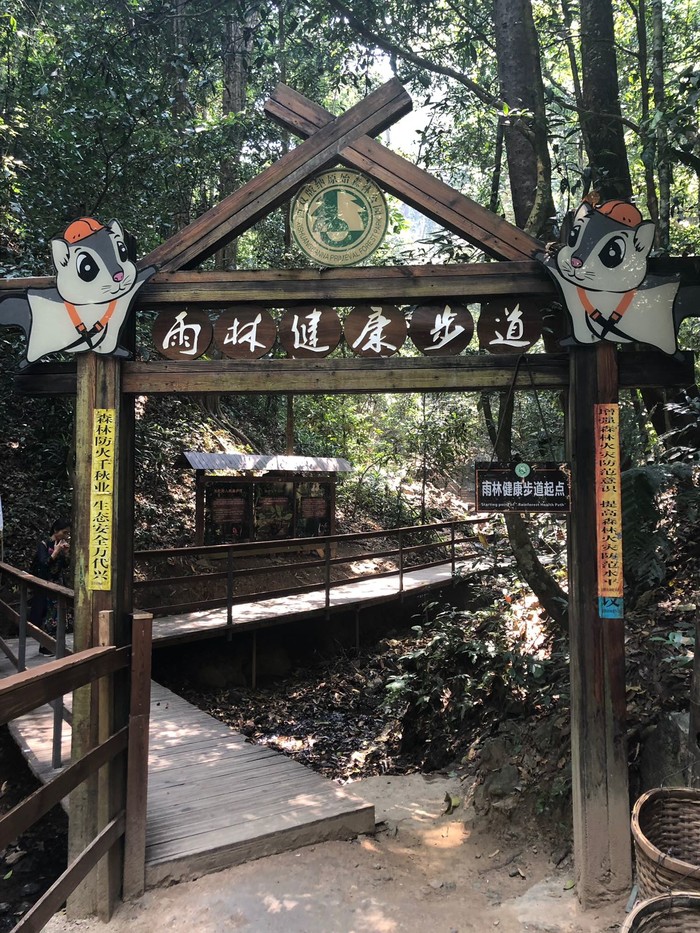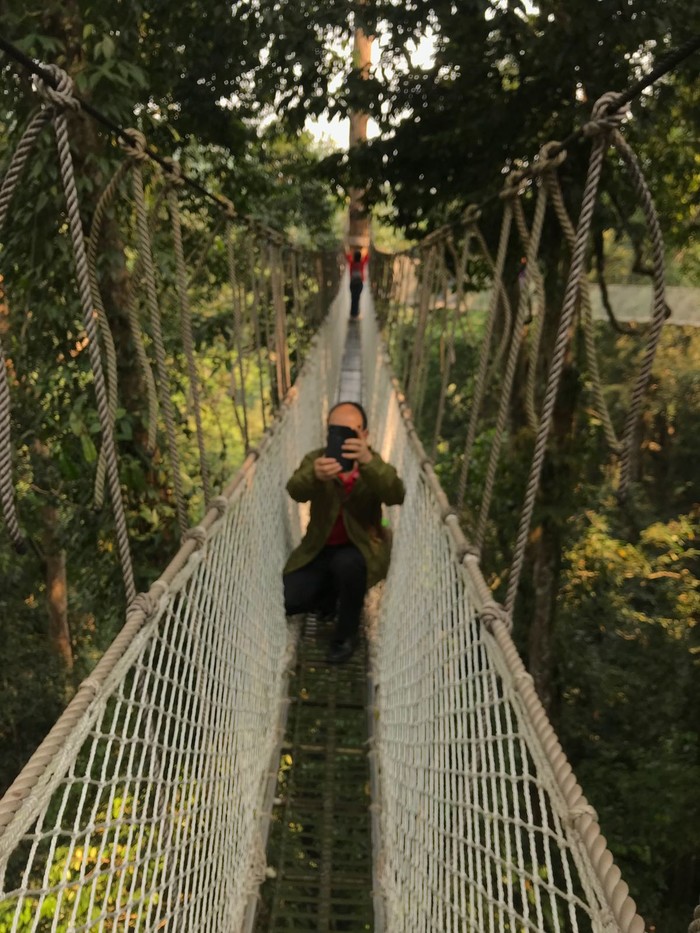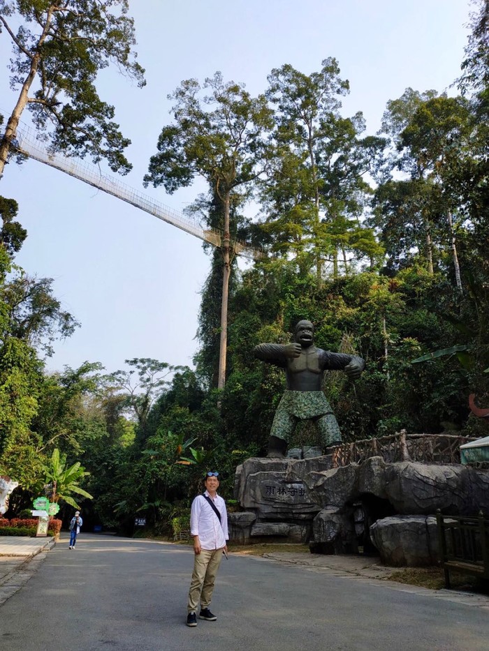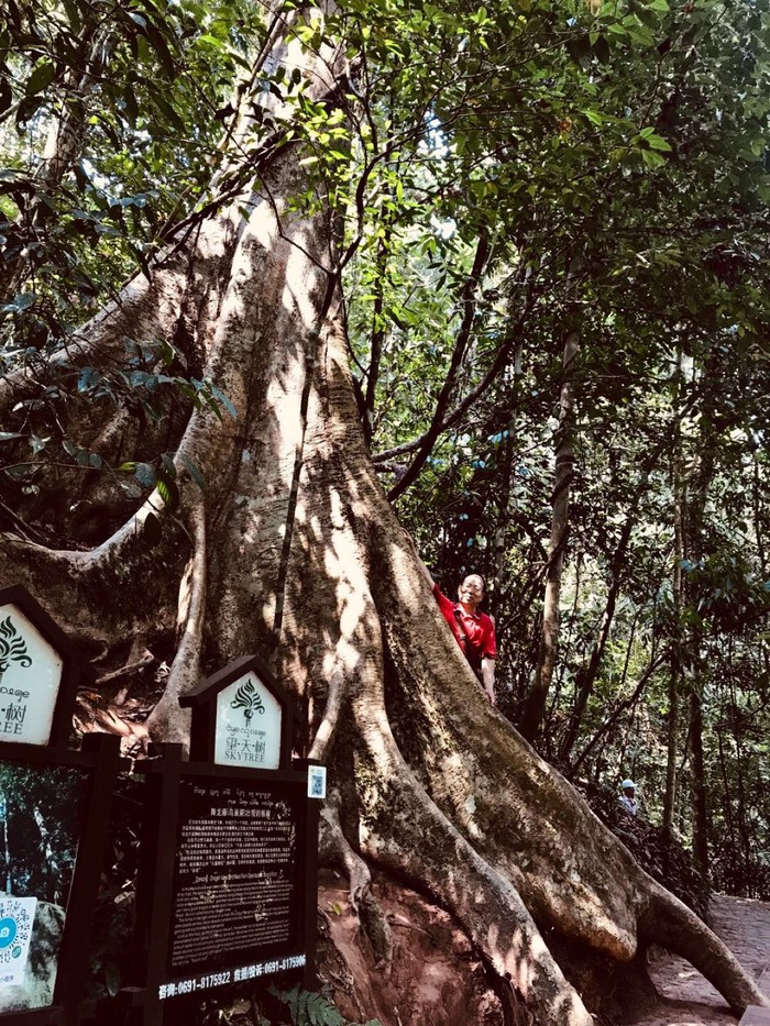 望天树景区离景洪市很远,要坐三小时的车才能到达。景区主要体验空中走廊,两位女士望而却步了。敢于探险的大哥,报名参团一日游(250元/人)。这个票价比较便宜,是找杨师傅(就是买湄公河篝火晚会门票的司机)帮忙定的,当地司机很有门路,而且找的是正规旅行团,不但包括游船、观光车、树冠走廊,还含午餐。出发地点,就在离酒店不远的泼水广场。
