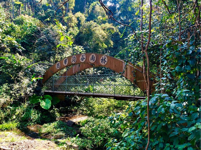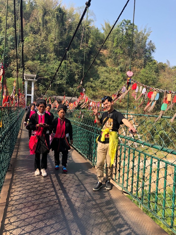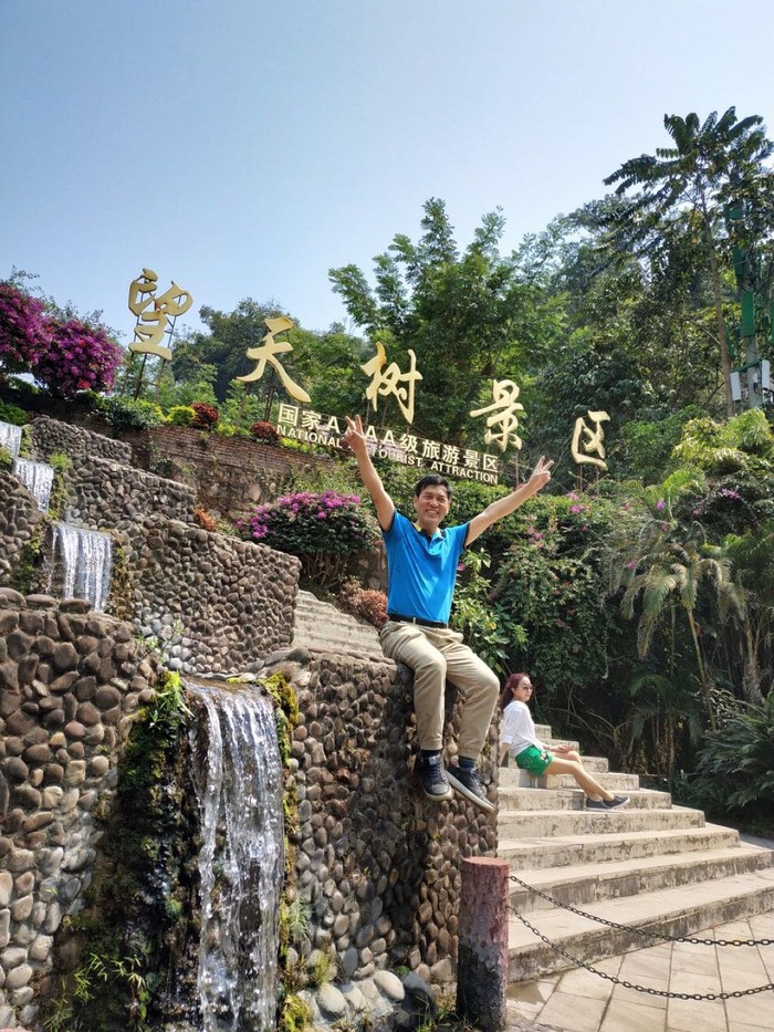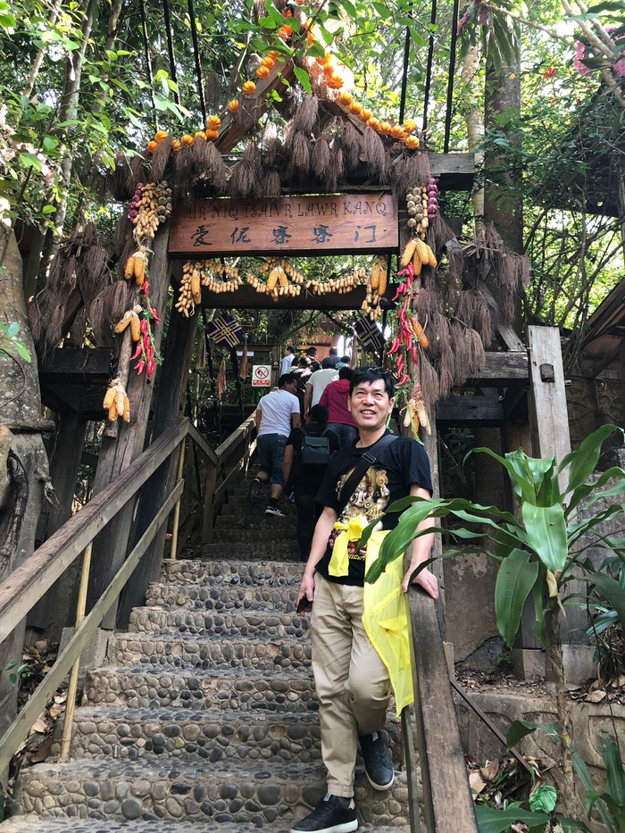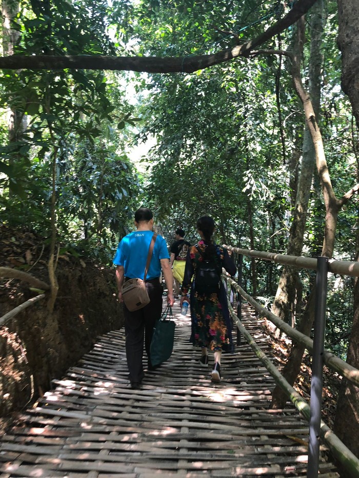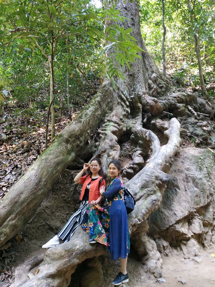 望天树景区离景洪市很远,要坐三小时的车才能到达。景区主要体验空中走廊,两位女士望而却步了。敢于探险的大哥,报名参团一日游(250元/人)。这个票价比较便宜,是找杨师傅(就是买湄公河篝火晚会门票的司机)帮忙定的,当地司机很有门路,而且找的是正规旅行团,不但包括游船、观光车、树冠走廊,还含午餐。出发地点,就在离酒店不远的泼水广场。