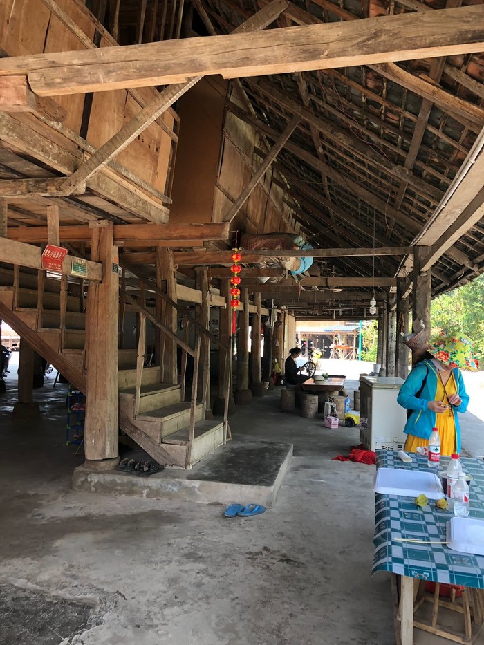 跟着主人上楼、脱鞋进入房间,房间比较大,中间还有柱头,四周木板有缝隙,进门的左边是一排布帘子,是睡觉的地方,右边,有些煮饭的用具⋯⋯还有冰箱