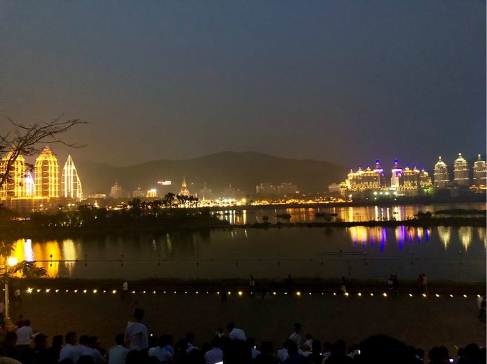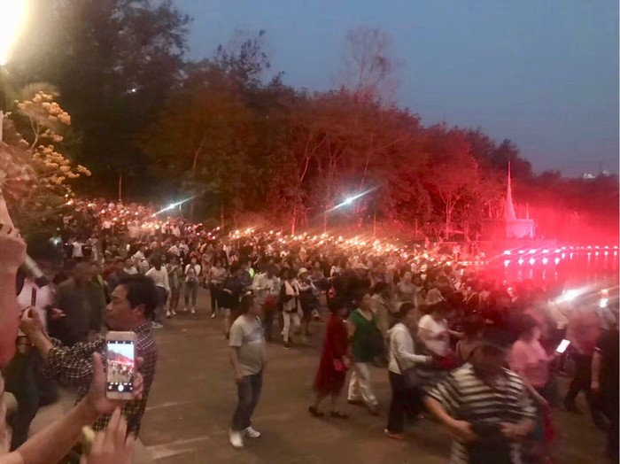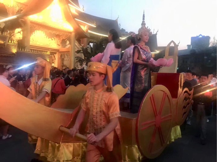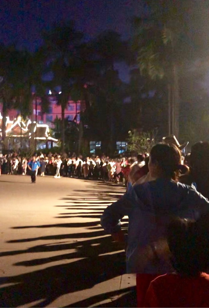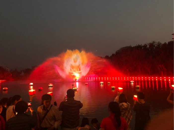 锣鼓队和彩车,很有气势的在前面开道。随后是拥挤的人流,每个人都举起水灯,汇成了一条烛光银河。我们顺着人流,来到放生湖边。广播传来一个男中音,标准的普通话 "各位朋友,欢迎来到我们千年放生湖,参加放水灯祈福祝愿的活动,大家不要忙着把水灯放下,看前方,在湖面上有尊释迦牟尼佛像,你可以面朝佛像,高举水灯,在心中许下一个,最虔诚美好的愿望,我们傣家长者,会为大家诵经祈福,待祈福经念完后,再把水灯放入湖面⋯⋯"(这段话是从视频回放中记录的)