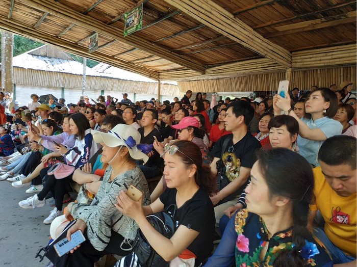 美女指挥打着节拍大声喊:"手机收起来,双手叉着腰,屁股扭起来。笑脸露出来。开心一点,朝前走……" 此时此刻,风趣幽默的互动,使快乐奔流,让人荡起喜悦的心舟。