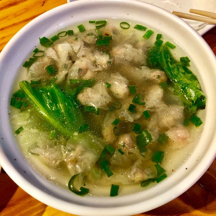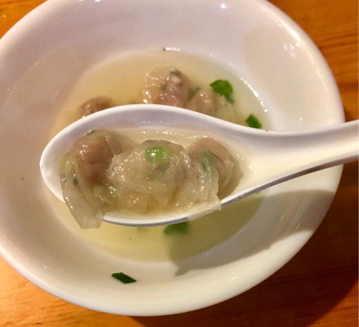 馄饨皮,是里脊肉打碎加地瓜粉做的,然后包上肉馅,煮熟后有点晶莹剔透,虽然很个小,但有嚼劲,滑溜溜的,很好吃。