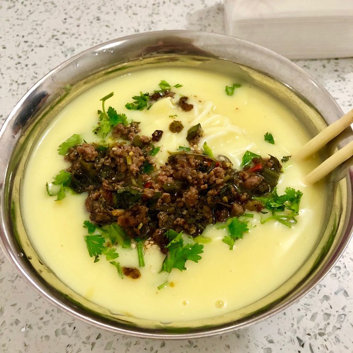 香喷喷,黄灿灿的豆汤牛肉面,很诱人。味道好不好,尝一下吧